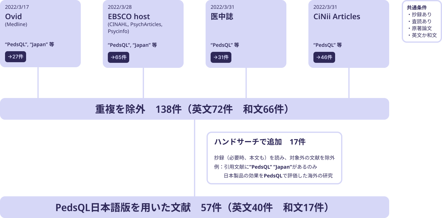 2022年3月31日に、以下の検索式・過程により、PedsQL日本語版を用いた研究を検索しました。